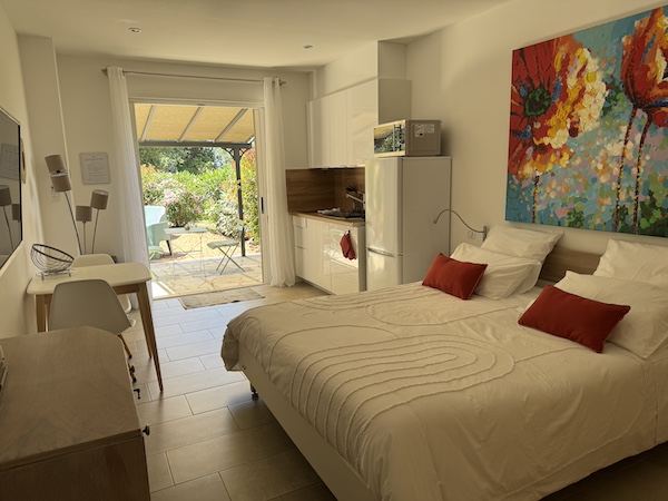 Kitchenette avec plaque à induction, micro-onde/grill, cafetière Nespresso, bouilloire et tout l’équipement nécessaire, TV écran plat, climatisation, wifi, terrasse couverte et jardinet avec salon de jardin.