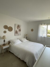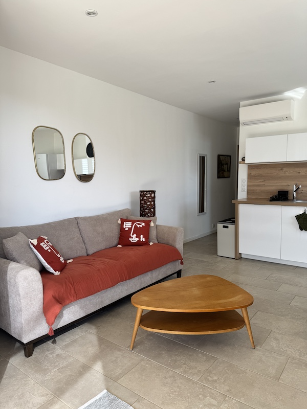 Patios di Pruno vous propose le T2 « Roccapina » de 44 m2 pouvant accueillir 2 adultes, 1 enfant et 1 bébé. Chambre spacieuse avec lit Queen Size et 1 lit pliant. Pour bébé, lit parapluie à la demande et gratuit.